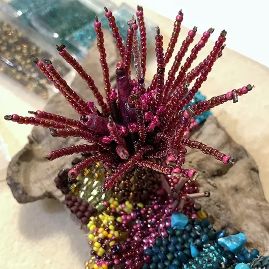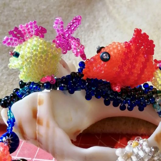 Je vous accompagne et vous guide pour créer votre projet personnalisé où la structure se crée sans rigidité et invite à la créativité. Vous choisissez vos couleurs et vous apprenez comment équilibrer et harmoniser coloris et techniques avec vos perles focus.