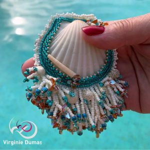 Avec ce Kit + Tutoriel exclusif PerlonZen®, je t’invite à créer ton propre bijou : un coquillage brodé, serti et embelli de franges Varvara, que tu pourras porter en sautoir, pendentif ou broche pour illuminer tes soirées.