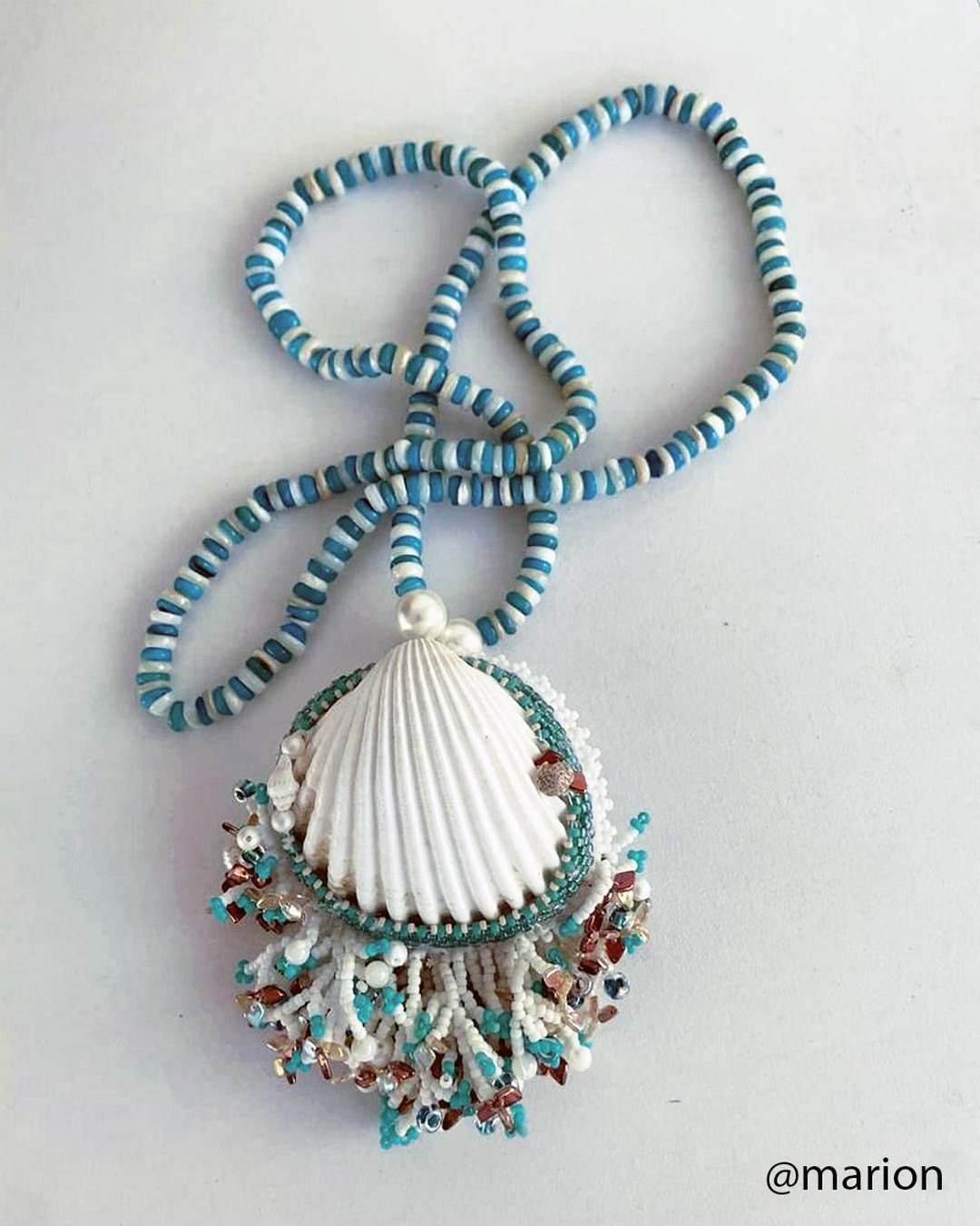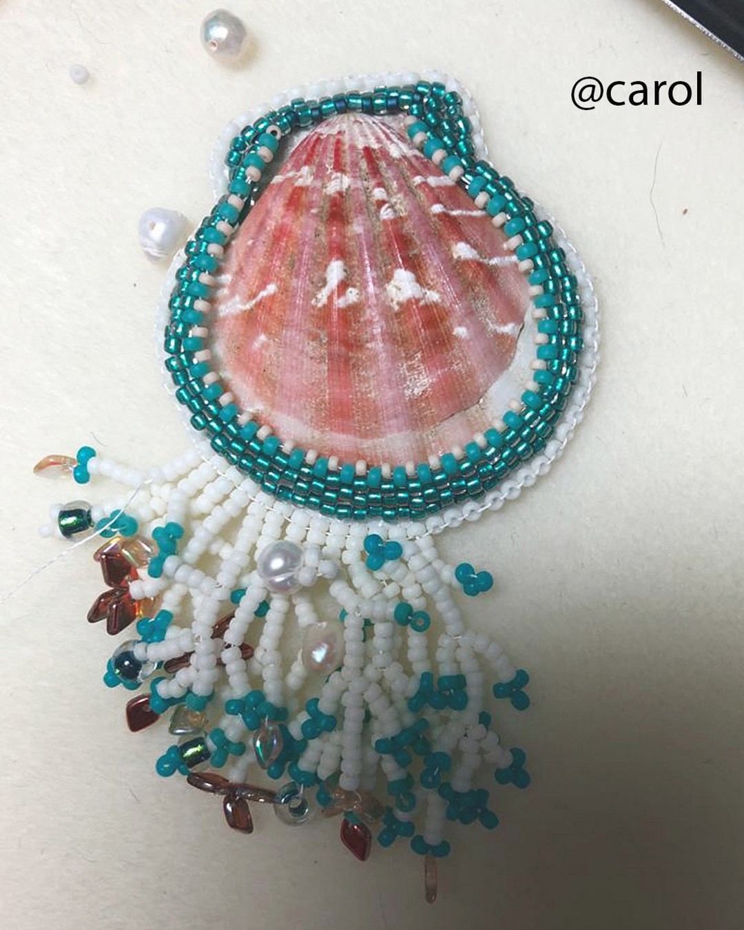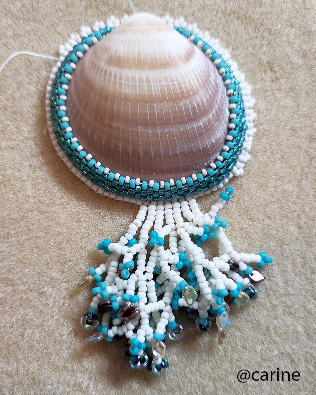 « J’ai été étonnée : je croyais ne pas y arriver et pourtant, en deux soirées, j’ai terminé mon pendentif. La coquille dédicacée a beaucoup touché ma mère. »Claire