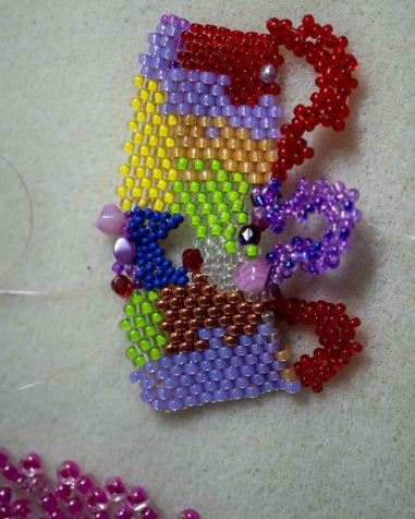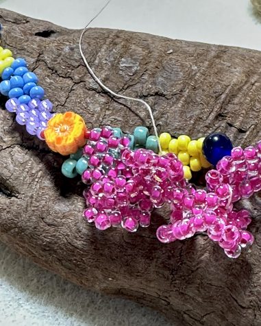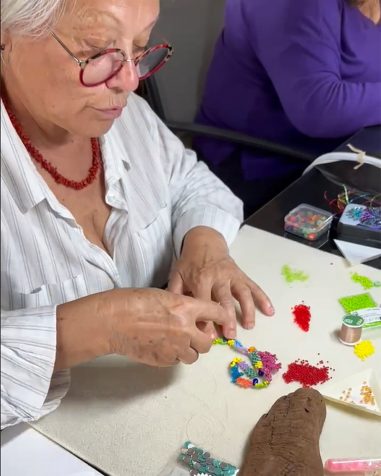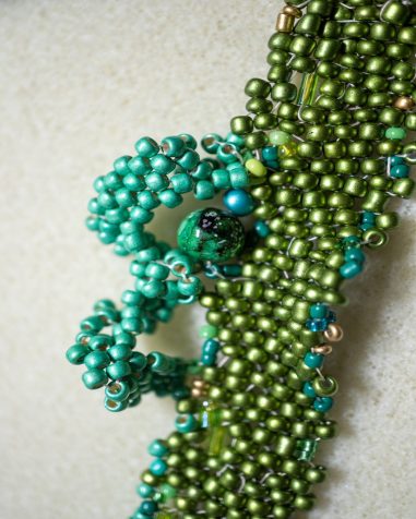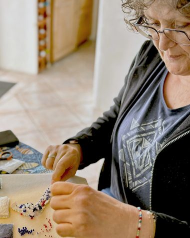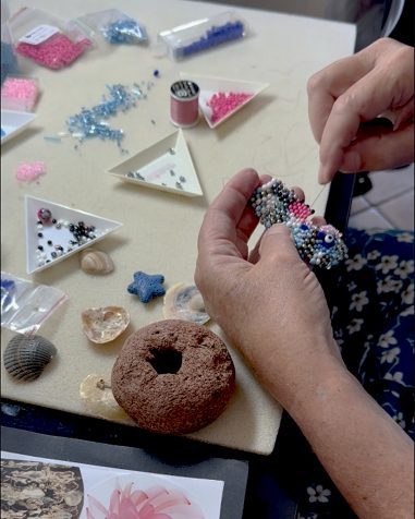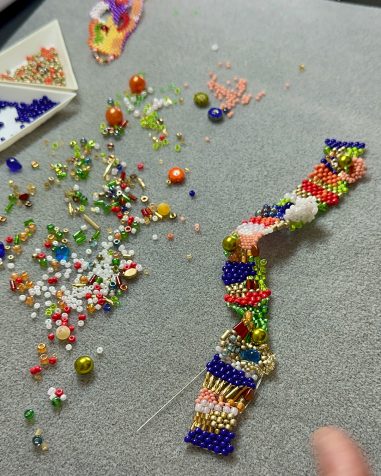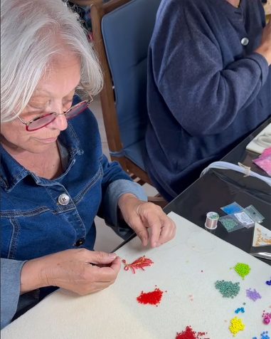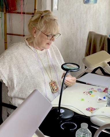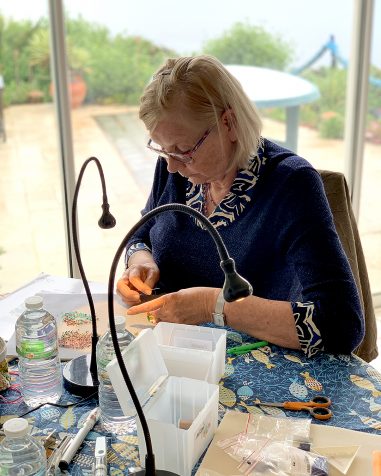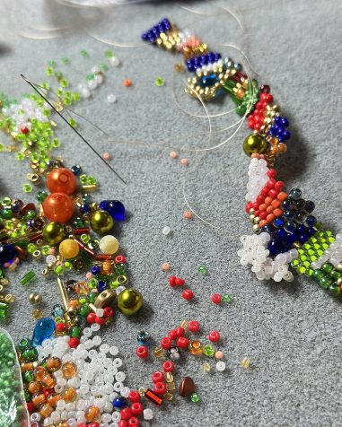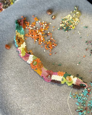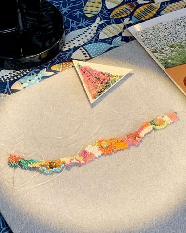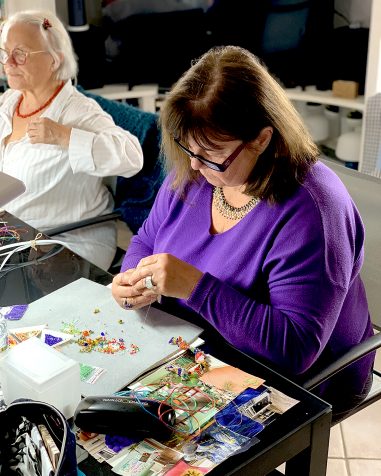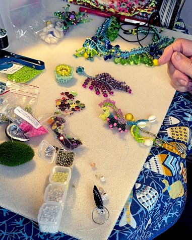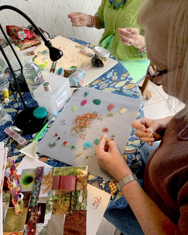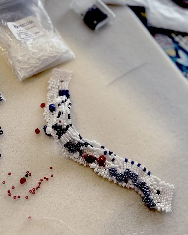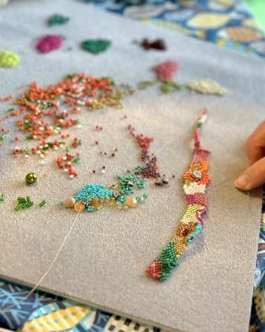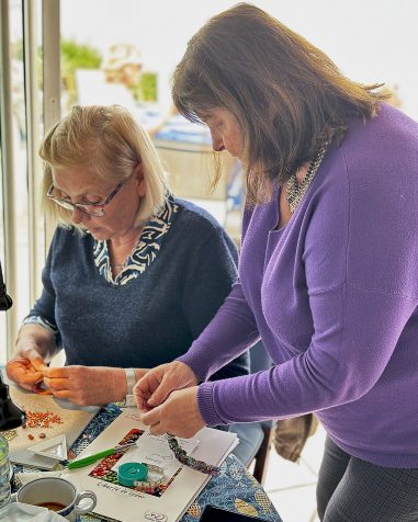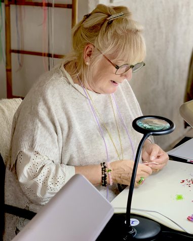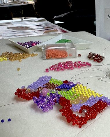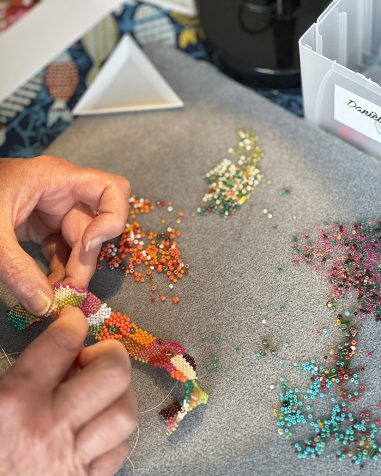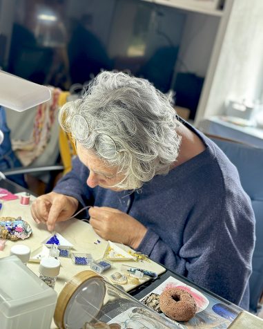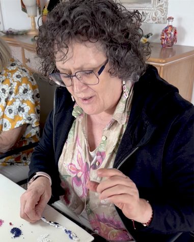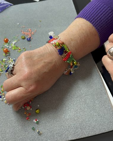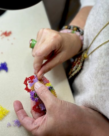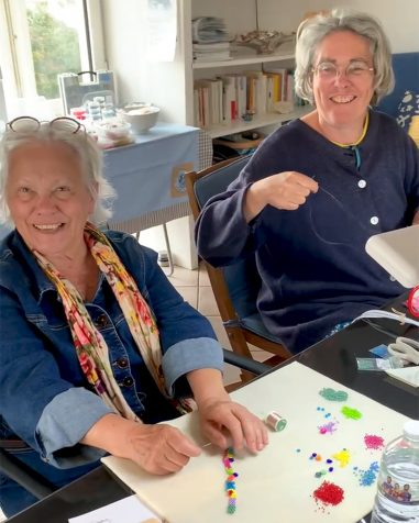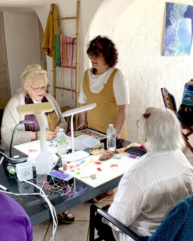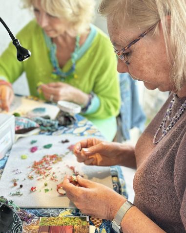 Deux tables de quatre places ont accueilli les huit participantes, qui ont en partie changé de place entre les deux journées, favorisant les échanges et la convivialité. Chaque perleuse disposait d’un éclairage individuel ainsi que d’un large choix de perles et d’accessoires mis à disposition. L’environnement de travail, soigneusement pensé, a permis à chacune d’évoluer dans des conditions optimales.